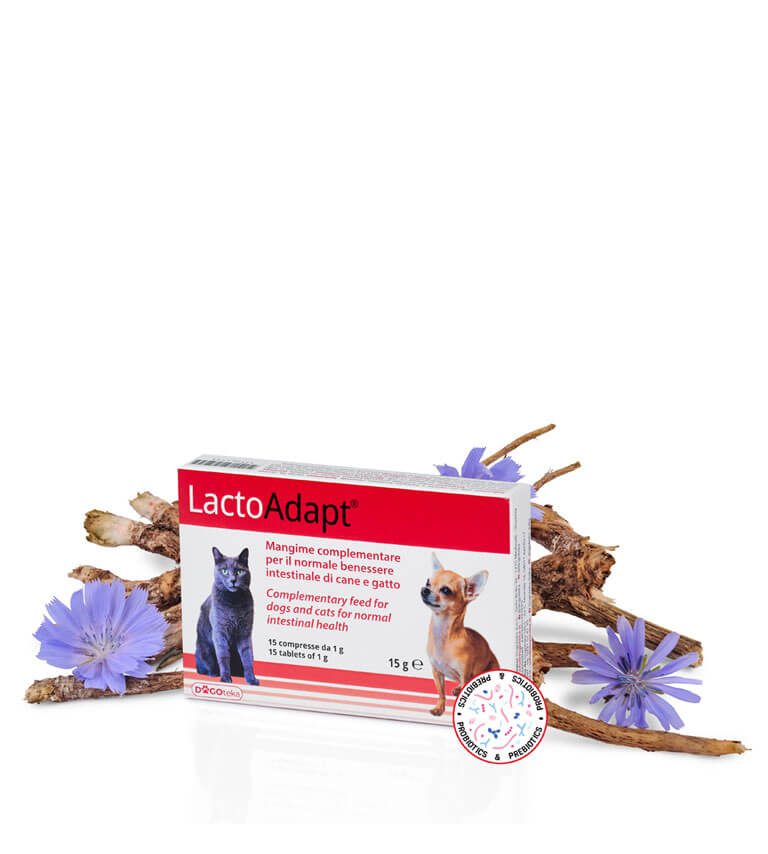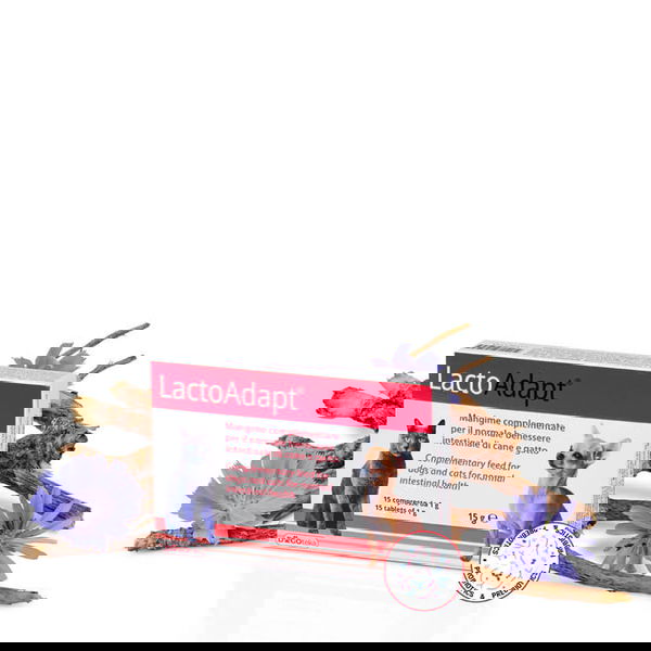 The LactoAdapt® dietary supplement contains active ingredients that help restore balance to the intestinal microbial flora. It is recommended for diarrhea and constipation, and as a preventive measure before stressful events such as visits to the vet, long car rides, or changes in diet. It can also be given to pregnant and nursing dogs, ensuring both the mother and her puppies remain free from digestive issues.