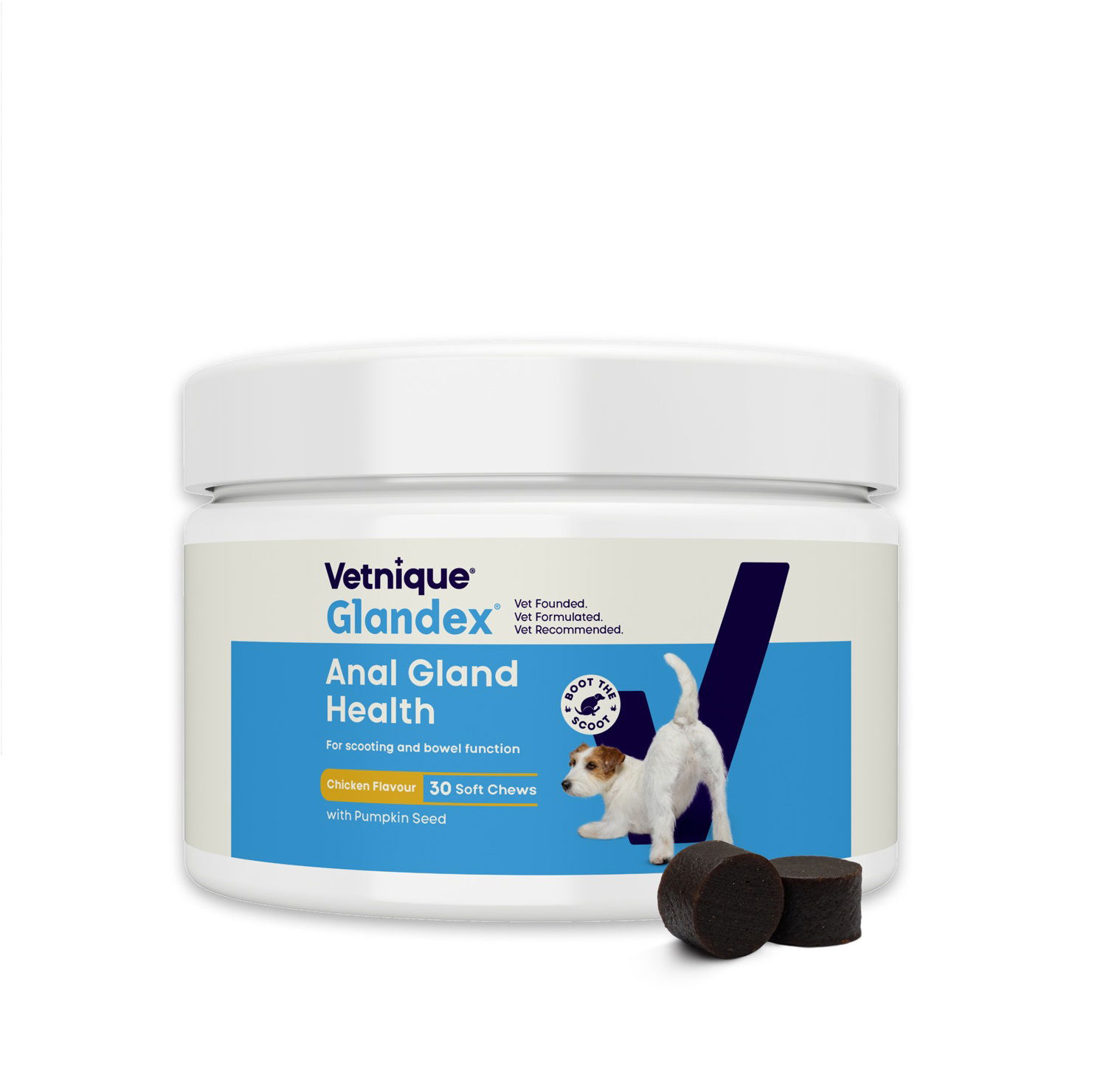 Glandex brand anal gland cleaning treats are specifically designed to address and prevent clogged anal glands. They are popular treats that many owners give to their dogs as a preventive measure, as they are dog-friendly and easy to dose. They have a positive effect on the natural process of anal gland cleaning and have a peanut butter flavor, which dogs love. They support digestion and intestinal flora, and thus naturally stimulate the process of anal gland cleaning.